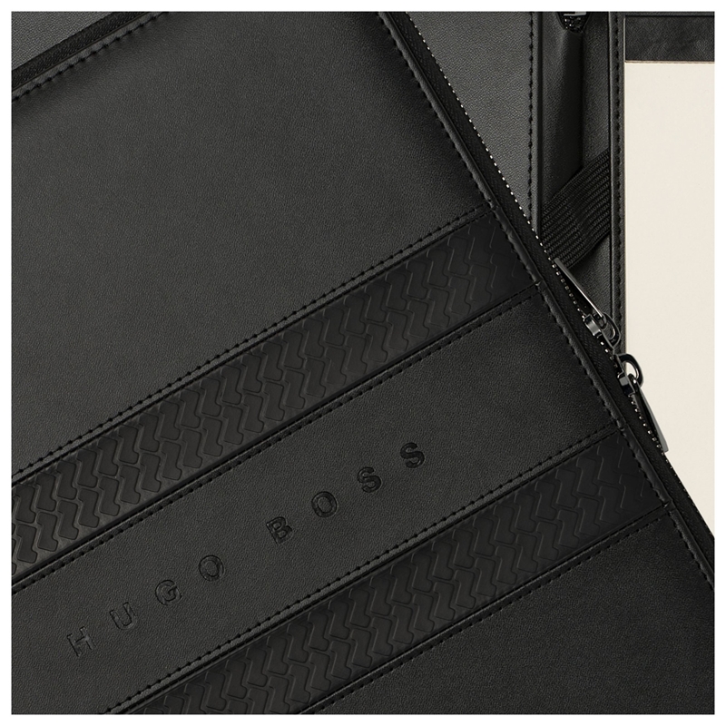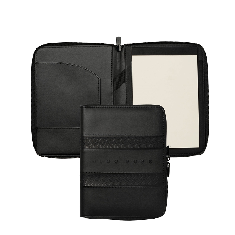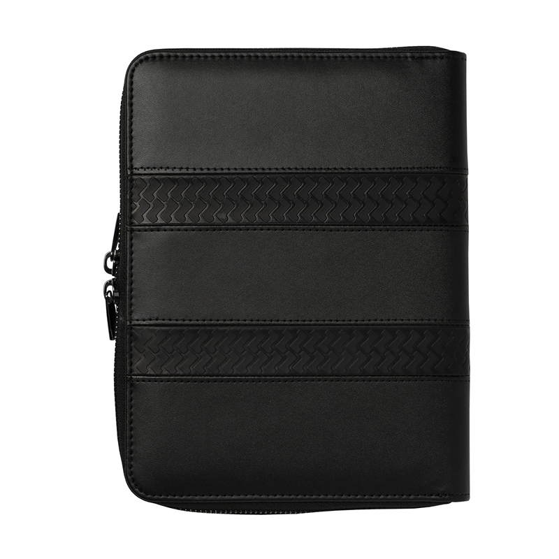 Конферентната папка A5 с цип „Tire“ е украсена с принт, вдъхновен от спортните автомобили, смесващ съвременния минимализъм с атлетична естетика. Лъскавите тъмни хромирани покрития придават на тази линия усещане за „градска“ изтънченост. Материал: полиуретан. Цвят: черен. Включен пад за писане с обем 40 листа.
