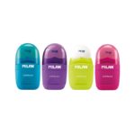 Практичен продукт, съчетаващ в себе си гума за триене и острилка. Атрактивен дизайн, специално разработен от компанията Milan. Острилката е оборудвана със здраво и добре заточено острие, произведено от въглеродна стомана, което я прави подходяща за различни видове моливи. С предпазна система, която гарантира, че острието няма да се откачи от корпуса на острилката. Идеален за училищна употреба. Налични цветове: син, лилав, розов и зелен.