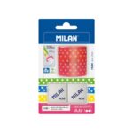 Двойна острилка, подходяща за подостряне на моливи със стандартна и MAXI големина. Атрактивен дизайн, специално разработен от бранда Milan. Острилката е оборудвана със здраво и добре заточено острие, произведено от въглеродна стомана, което я прави подходяща за различни видове моливи. С предпазна система, която гарантира, че острието няма да се откачи от корпуса на острилката. Меки гуми с квадратна форма, произведени от синтетичен каучук. Подходящи за корекция на линии с различна степен на твърдост, нанесени върху всякакви видове хартия. Индивидуален размер на гуменото тяло: 2.8 x 2.8 x 1.3 cm. Включените продукти в опаковката са идеални за училищна употреба.