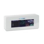 Метеостанция с цветен LED дисплей. Изход: USB кабел. Материал: пластмаса. Размери: 140 x 55 x 35 mm. Възможност за надписване и брандиране. Рекламна площ: 130 x 10 mm. Устройството работи с 3 AAA батерии (не са включени в опаковката). Приложима технология на брандиране: тампонен печат, дигитален печат.