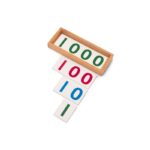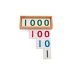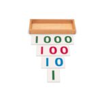Богатата колекция от учебни помагала на Montessori включва материали за развитие, предназначени за работа с деца от 2 до 14-годишна възраст. Продуктите позволяват на децата да придобият знания, компетентност, умения и опит чрез собствените си действия, ангажиращи всички сетива. Учебните материали, включително математически, ботанически и географски карти, са в класически форми, изработени от висококачествено дърво. Номерирани карти с цветни числа в съответствие с методологията на математическо образование Монтесори. Комплектът учи да се създават многоцифрени числа. Под формата на дървени плочи, картите изобразяват цифри в следните цветове: зелено – единици, синьо – десетки, червено – стотици и зелено – хиляди. Съдържание: – 1 карта с единици; – 1 карта с десетици с размери 7 x 0,5 x 5,5 cm; – 1 карта със стотици с размери 11 x 0,5 x 7 cm; – 1 x карта с хиляди с размери 16,5 x 0,5 x 7 cm. Размери кутията: 25 х 3 х 10 cm. Предназначен за деца над 4-годишна възраст.