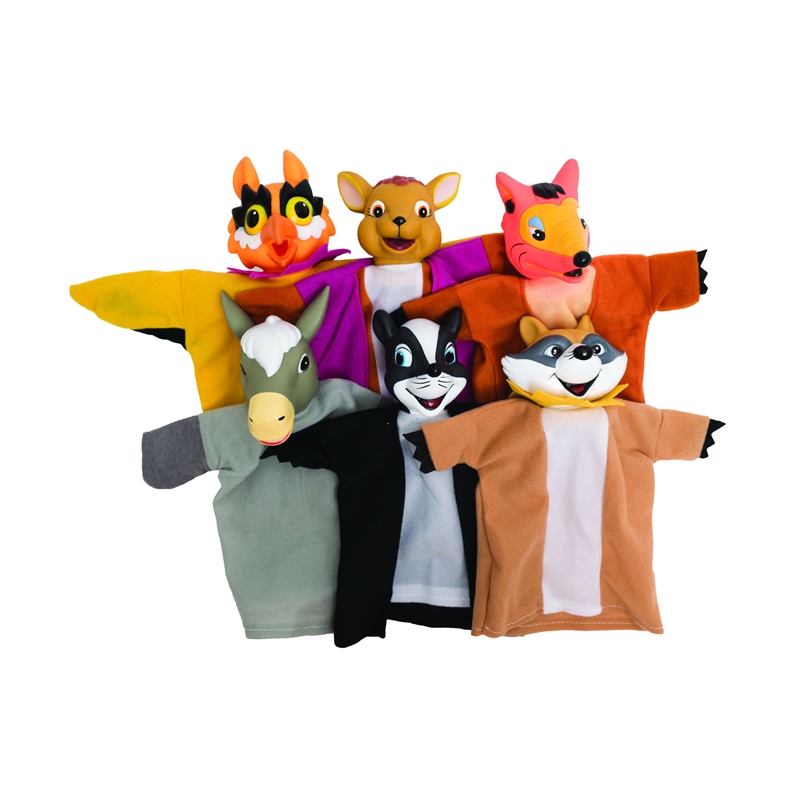 Комплектът от 6 кукли включва: бухал, елен, лисица, магаре, скункс, миеща мечка. Размери: височина: 22 cm, широчина 22 cm.