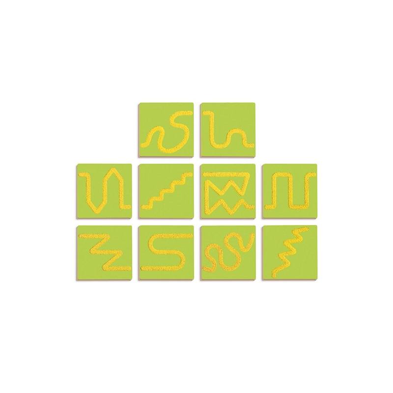 Плочки с пясъчна текстура. Движението на пръста по грапавата линия стимулира усещането за допир и подобрява зрително-моторната координация. По този начин детето научава нови геометрични форми и развива концентрация. Упражнението е подходящо за всяка ръка. Моделът е покрит със смола, което го прави изключително издръжлив. При необходимост може да се почиства с влажна кърпа. Комплектът съдържа 10 плочки от MDF с размери 15 x 15 cm и дебелина 1.2 cm.