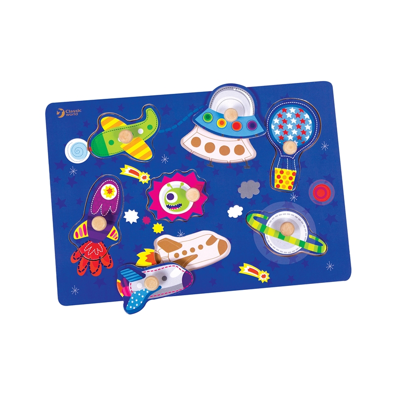 Космически пъзел с части, които се премахват и могат да служат като космически кораби за игра. След края на играта ги поставете обратно в космическия пъзел. Размери: 30 х 2 х 21 cm. За деца над 18-месечна възраст. 8 части.