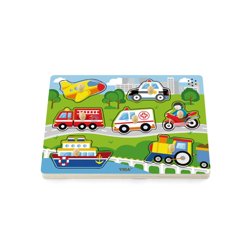 Пъзел за най-малките, който помага да се научат да разпознават превозните средства и звуците, които те издават. След като се съпостави парче с превозно средство с правилната картинка в основата, може да бъде чут характерният звук на превозното средство. Комплектът съдържа 8 елемента: – Основа 30 x 3.3 x 22.5 cm; – 7 пъзела с дръжки (самолет, полицейска кола, пожарна кола, линейка, мотоциклет, кораб, локомотив). Материал: дърво. Подходящ за деца над 18-месечна възраст.