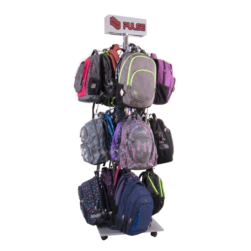 Дисплеят е лесен за монтаж, компактен и лесен за придвижване. Не заема много място. Раниците са добре изложени и лесно достъпни за клиентите.Подходящ за 24 раници. Размери: височина – 175 cm, основа за стойка – 60 x 60 cm.