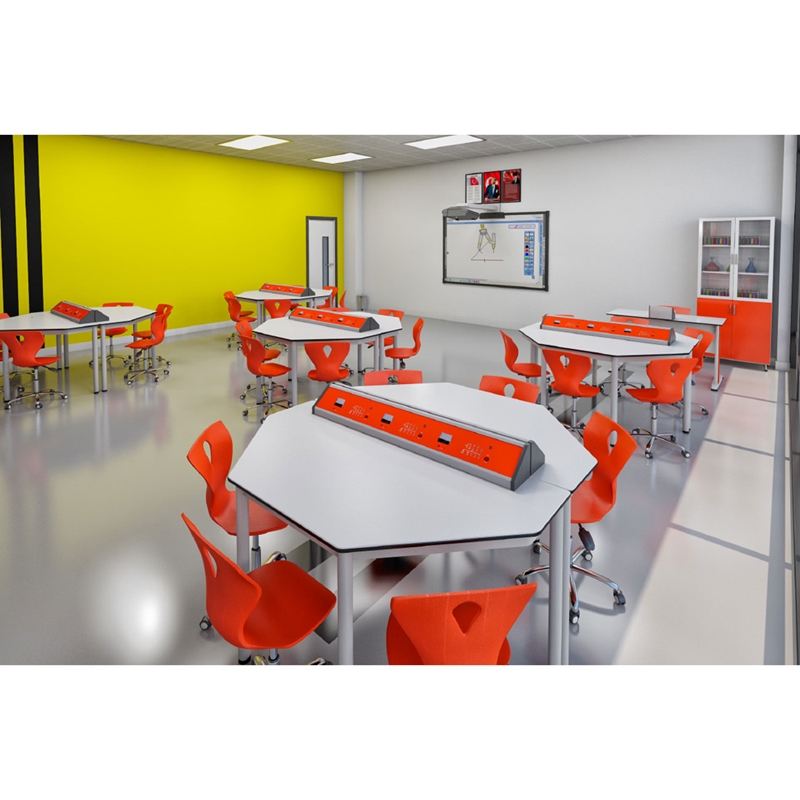 Кабинетът по физика Hexa е снабден със захранване и измервателни устройства, необходими за експерименти, обособени на всяка ученическа маса