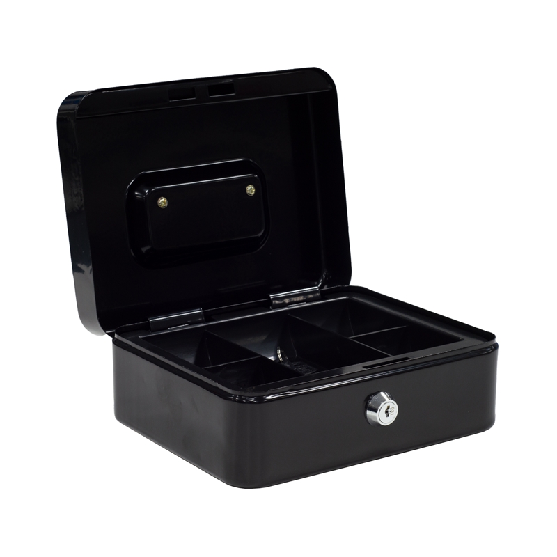 Преносима каса за пари тип Cash box. Изработена от специално обработена стомана с покритие от емайллак. Със заоблени ъгли и метална дръжка за удобство при пренасяне. Подходяща за съхранение и пренасяне на оборотни пари в магазини, банки, таксита, офиси и други. Разполага със секретен патрон с 2 ключа. С подвижна пластмасова поставка за монети. Размери: 90 x 200 x 160 mm. Цвят: черен.