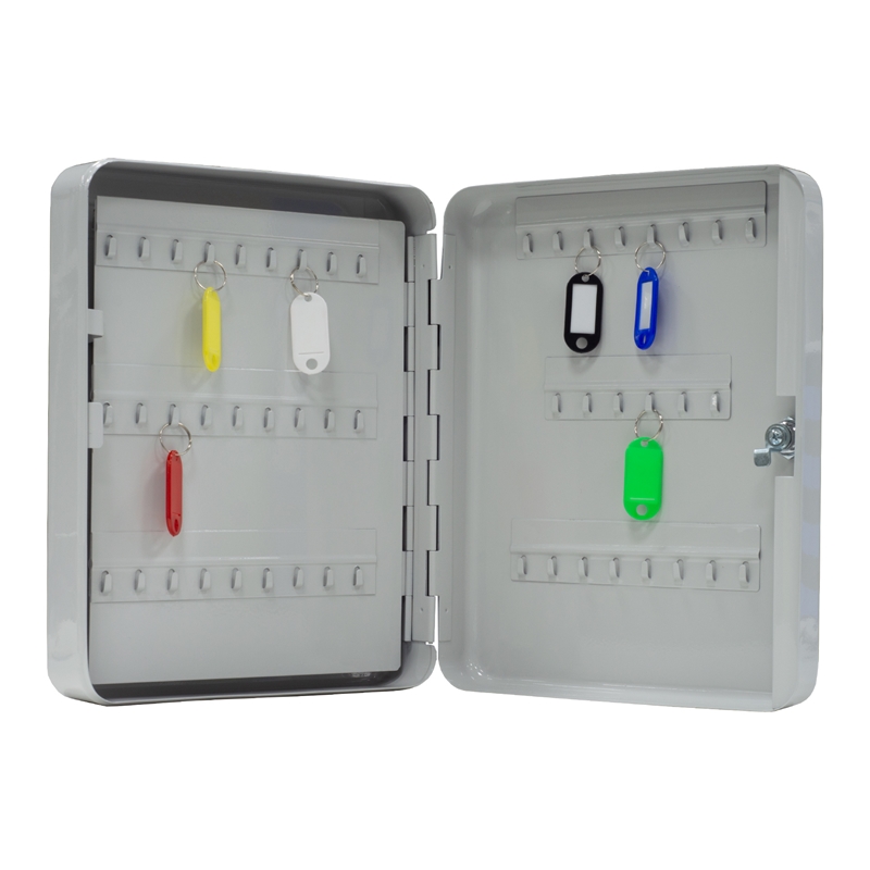 Метална каса, табло за съхранение на ключове. Заключващ механизъм с два ключа. За сигурно съхранение и лесно намиране на желания ключ. Номерирани кукички с етикети за надписване. За стенен монтаж с включени крепежни елементи. Размери: 200 x 160 x 75 mm. Цвят: Сив. Капацитет: 20 ключа.