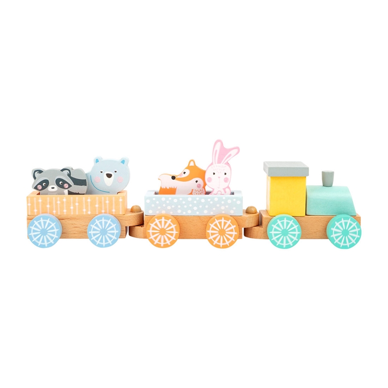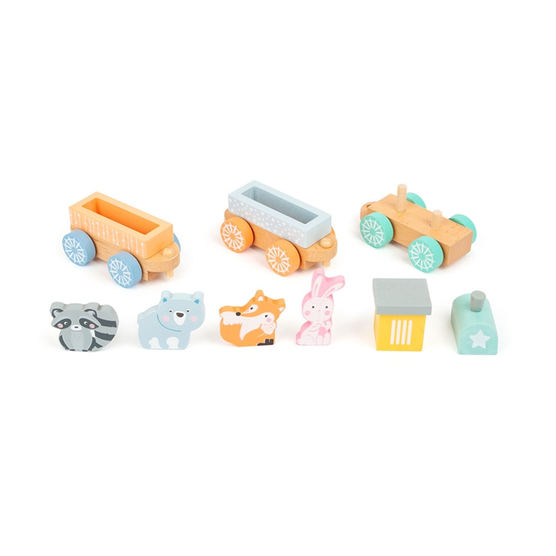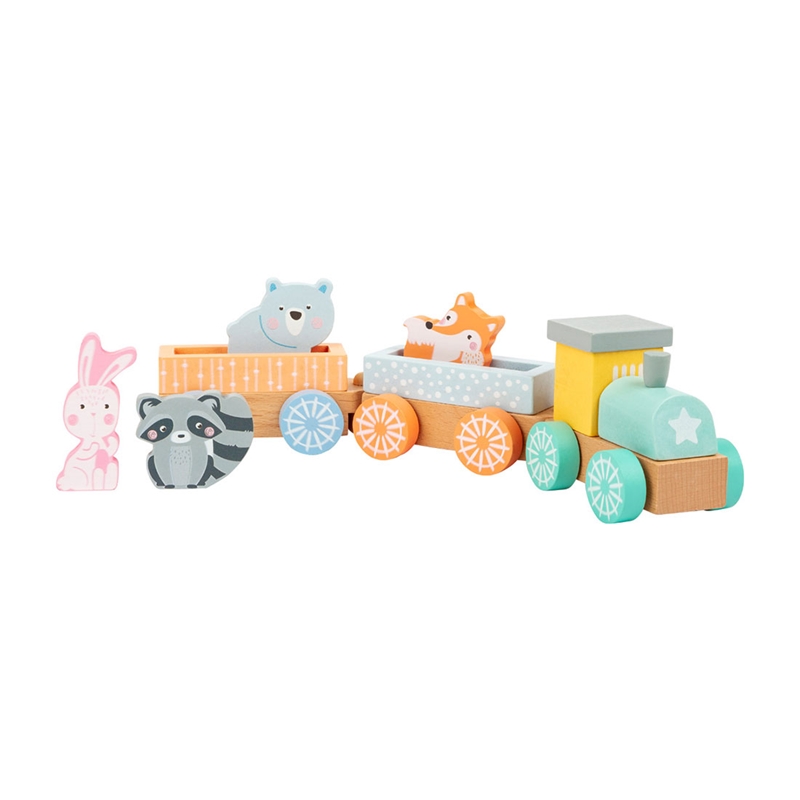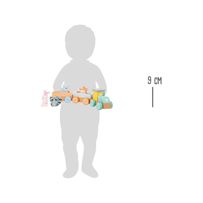 Ту-туу, ето, влакът идва! Този влак в пастелни цветове предлага всякакви забавления на борда! Двата вагона могат да бъдат прикрепени заедно чрез лесна връзка. Малкият локомотив издърпва двата вагона, в които има място за четирите животински пътници. И всеки иска да се вози: лисицата, зайчето и техните приятели очакват с вълнение пътуването през детската стая! Всички продукти на марката Small Foot са изработени от 100% сертифицирана дървесина и безвредни бои за играчки, което ги прави изцяло безопасни за здравето на децата. За деца над 18-месечна възраст.