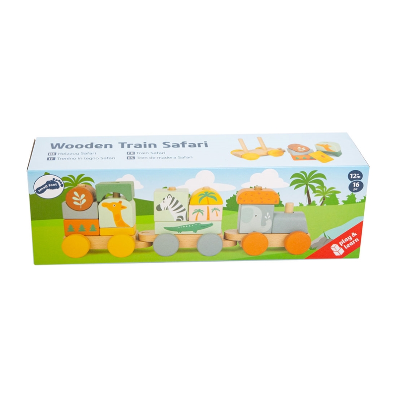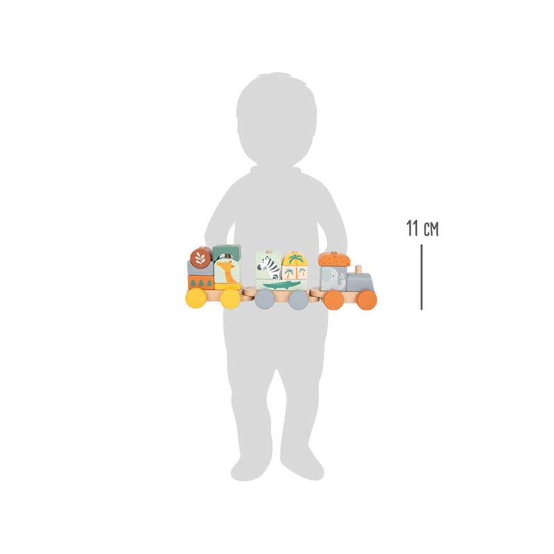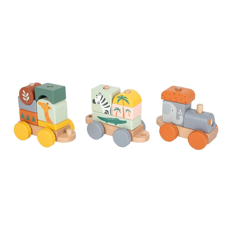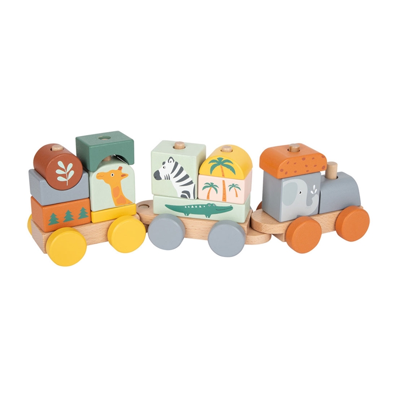 Съберете го и тръгвайте! Този дървен влак в модерни цветове отива на голямо пътуване през детската стая само след като се качат слонът, жирафът, зебрата и техните приятели! Богато детайлизираното влакче, предлага на децата възможността да строят и подреждат частите според собствените си идеи и развиват двигателните им умения. Отделните блокчета могат да се използват и отделно като градивни елементи. Следваща спирка: Сафари! За дълготрайно и разнообразно забавление в детската стая!