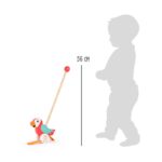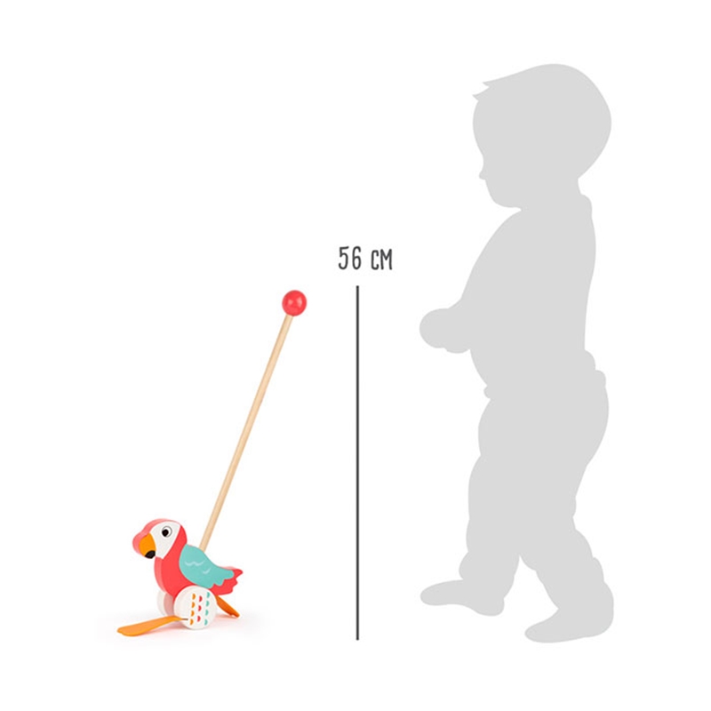 Всяко малко дете обича да се разхожда с този цветен папагал! Когато се бута, глупавият папагал мърда краката си с всяко завъртане на колелата. Този забавен спътник може лесно да се бута наоколо благодарение на дървената топка на дръжката.