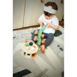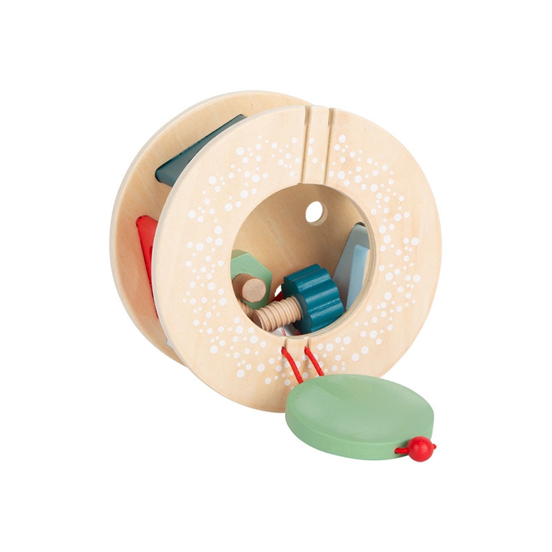 Побързай, малко охлювче! Този дървен охлюв за дърпане с еластични рогца, приятелски очи и гумени колела вдъхновява децата да се научат да ходят, като същевременно подобрява двигателна им активност, умението за вмъкване на фигури и използване на винтове. Когато се дърпа, подвижната черупка на охлюва се завърта и кара вмъкнатите части вътре да издават шум. Тези части могат да се завинтват и към другата страна на черупката на охлюва и благодарение на цветните маркировки се тренира разпознаването на цветове и форми. Комбинацията от естествено, необработено дърво и модерни цветове прави това дърпащо се животно наистина привличащо вниманието! Черупката на този весел охлюв е подвижна и позволява индивидуално сортиране на ярко оцветените вмъкващи се елементи. Частите могат да се съхраняват в завинтено състояние за тихо съхранение, така че да не тропат из къщата, когато бъдат издърпани следващия път. Умна играчка за двигателна активност за вмъкване на фигури и използване на винтове.