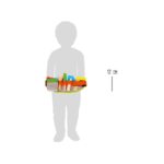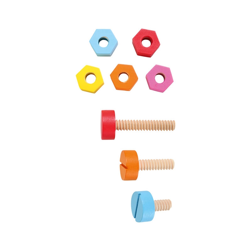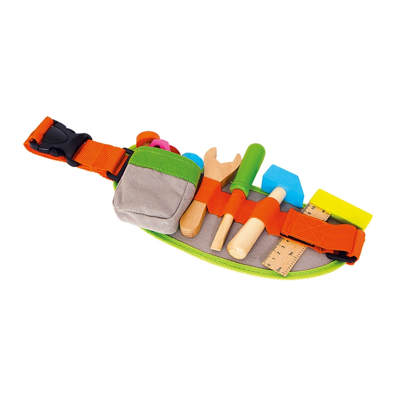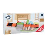 С този колоритен колан за инструменти, малките майстори са много добре подготвени за ремонтите вкъщи. Включва линийка, отвертка, чук, гаечен ключ, три винта и пет гайки от масивно дърво с цветно лакиране. Дължината на колана може да се регулира от 41 до 103 cm. Катарамите се отварят и затварят бързо.