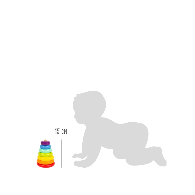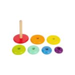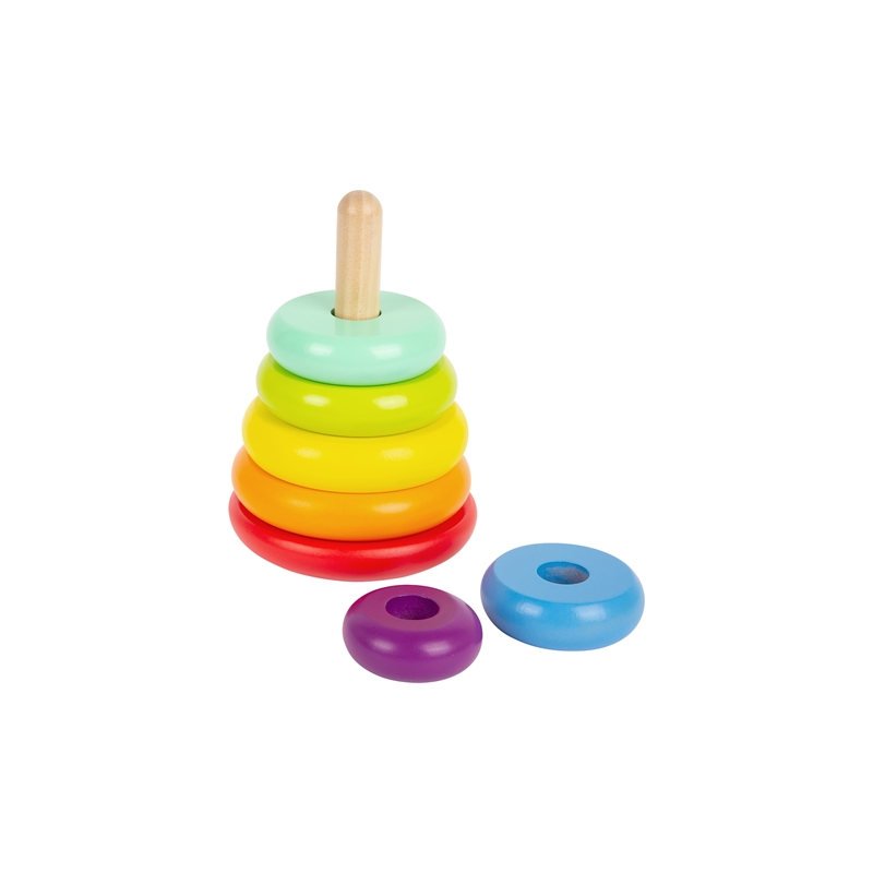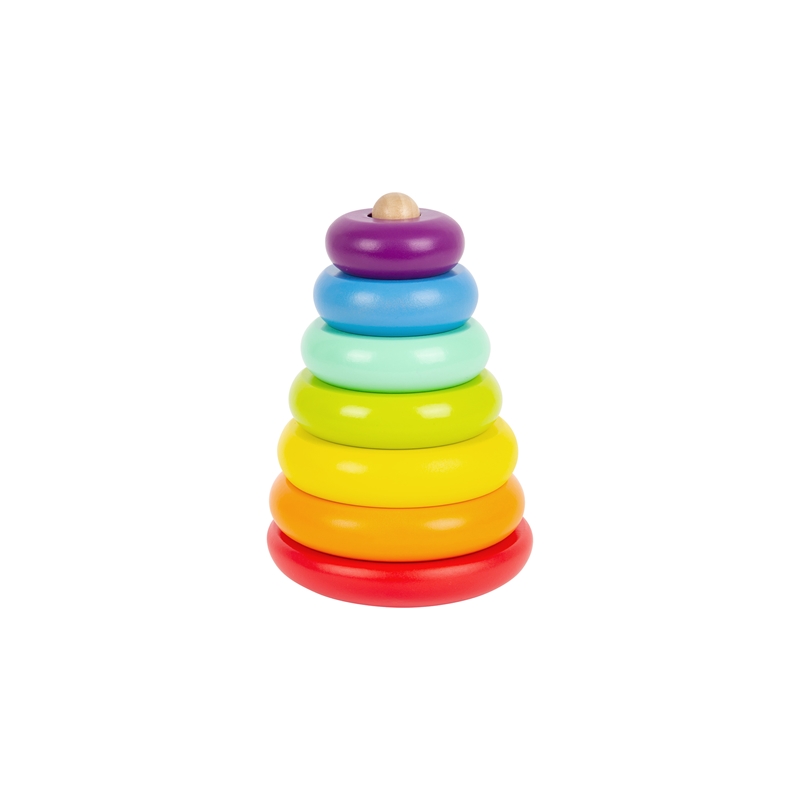 Кула за нанизване и подреждане на кръгове в цветовете на дъгата. Тренира двигателни умения, координацията око-ръка и разбирането на форми и размери. Заоблената основа, която позволява на подреждащата кула да се люлее напред-назад, осигурява допълнителна радост за малчуганите. Дървената кула за подреждане е класика, а цветовете й я правят модерна и стилна. Размери: 10 x 15 cm.