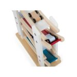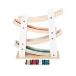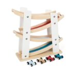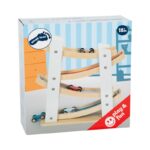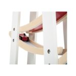 Дървена състезателна писта със стабилна основа. Осигурява бързина на четирите малки дървени колички, които се спускат по рампите. По време на пътуването си от етаж на етаж, количките изпълняват забавни салта и доставят много забавление. Боядисана в бяло, с части от естествено дърво, тази писта наистина привлича вниманието и се вписва идеално във всяка детска стая. Насърчава развитието на двигателните умения, както и координацията между ръцете и очите, като същевременно премахва скуката в детската стая!