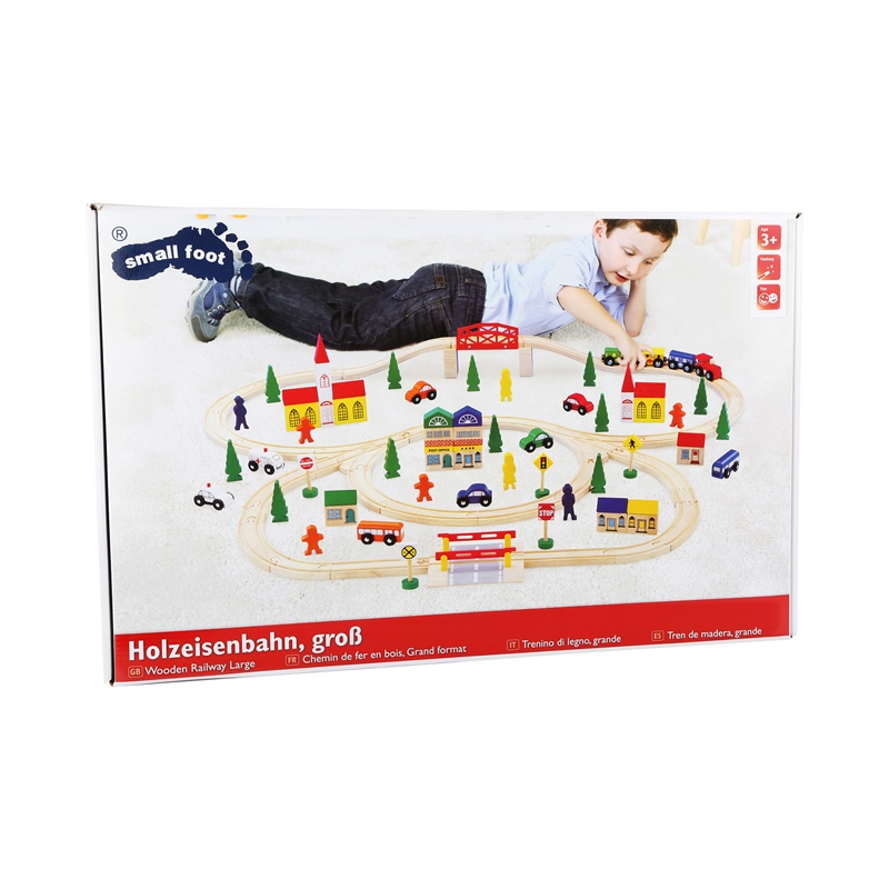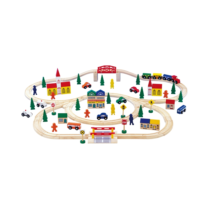 Повече от забавление! Дървен комплект писта, който включва 100 части. Разполага с редица разнообразни аксесоари, които предоставят най-различни възможности за изграждане на идеи за игра. Релсите, мостовете, бариерите, превозните средства, фигурките, пътните знаци, къщите и дърветата могат да бъдат постоянно пренареждани, за да се изграждат все по-сложни писти. Забавлението ще се премести завинаги в детската стая! Размери: 100 х 98 х 12 cm.