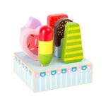 Вкусно! Устата на всеки фен на ледените близалки ще се напълни със слюнка, когато види тези различни видове сладоледи, изработени от 100% сертифицирана дървесина. А дървената поставка е идеална за представянето им. Прекрасна, творческа възможност за ролева игра.