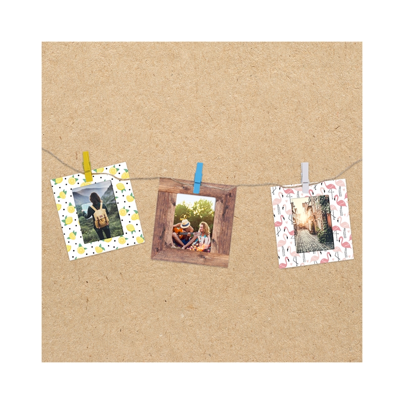 Уникален стил за уникални личности! Благодарение на тези 10 хартиени рамки разполагате с 5 цвята и 5 дизайна, чрез които да подредите и декорирате любимите си спомени, запечатани в снимки. След това просто трябва да ги окачите с помощта на включените в опаковката щипки и въженце, за да създадете своя фото шедьовър. Цялостната композиция зависи само и единствено от вас! Продукт, подходящ Zink хартия и снимки, направени с фотоапарат Instax Mini film. Индивидуални размери на всяка рамка: 10 x 13 x 7 cm.